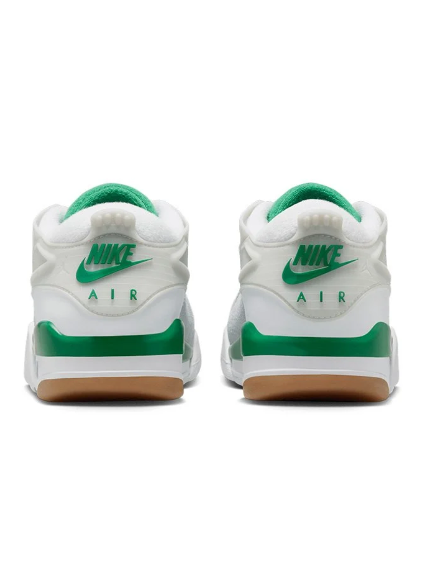 Dominującym akcentem kolorystycznym jest głęboka zieleń „Pine Green”, przełamana kontrastową bielą oraz elementami czerni, co tworzy dynamiczny i nowoczesny efekt wizualny. Charakterystyczne detale, takie jak plastikowe skrzydełka, tłoczone logo Jumpman i boczne panele z siatki, dodają sylwetce sportowego charakteru z nutą retro.